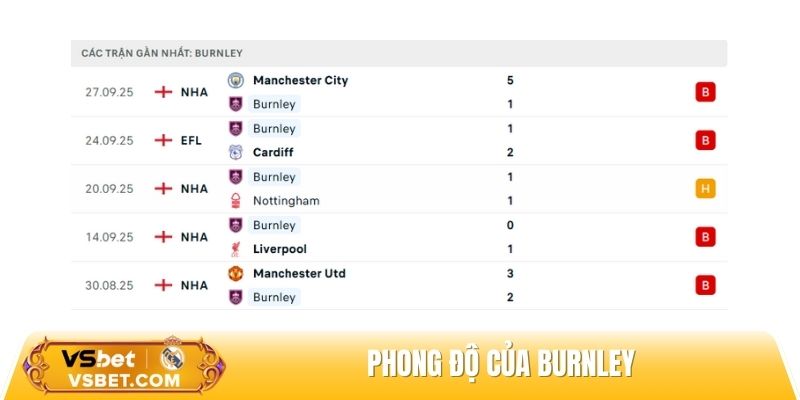 Trái ngược hoàn toàn với đối thủ, Burnley đang thể hiện phong độ thi đấu thất vọng trong thời gian gần đây. Theo thống kê kết quả bóng đá mới nhất, họ đã để thua 4/5 lần ra quân gần nhất và không thể giành chiến thắng. Do vậy, không mấy khó hiểu khi mà đội khách là 1 trong 3 CLB đang nằm trong nhóm cầm đèn đỏ sau 6 vòng đã đấu.