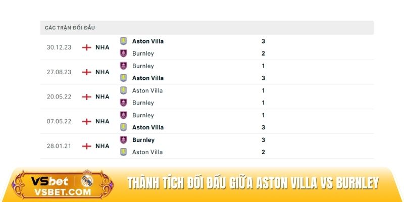 Thành tích đối đầu giữa Aston Villa vs Burnley