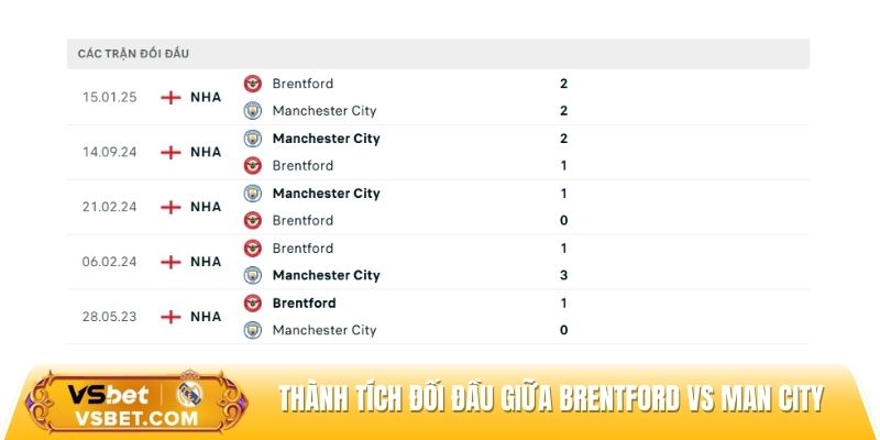 Thành tích đối đầu giữa Brentford vs Man CIty