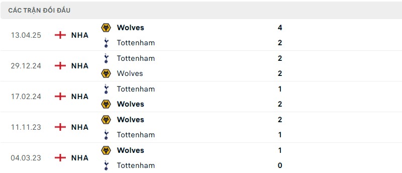 Lịch sử đối đầu gần đây gây bất ngờ khi Wolves chiếm ưu thế với 4 chiến thắng trong 6 lần gặp nhau gần nhất. Tuy nhiên, tại sân nhà của Tottenham, thành tích lại cân bằng với mỗi đội có 1 chiến thắng trong 3 trận. Dù vậy, với phong độ trái ngược hiện tại, rất khó để Wolves có thể tái lập thành tích này.